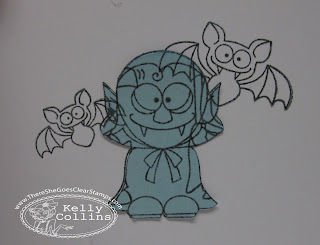 The first step is to create the mask. I chose Dracula here from this set and stamped him once on a Post-It paper (blue here) and once on my white cardstock. Then I carefully cut out the blue dracula to form my mask. (Once I create a mask for a stamp set, I store it with the stamp set for future use.)